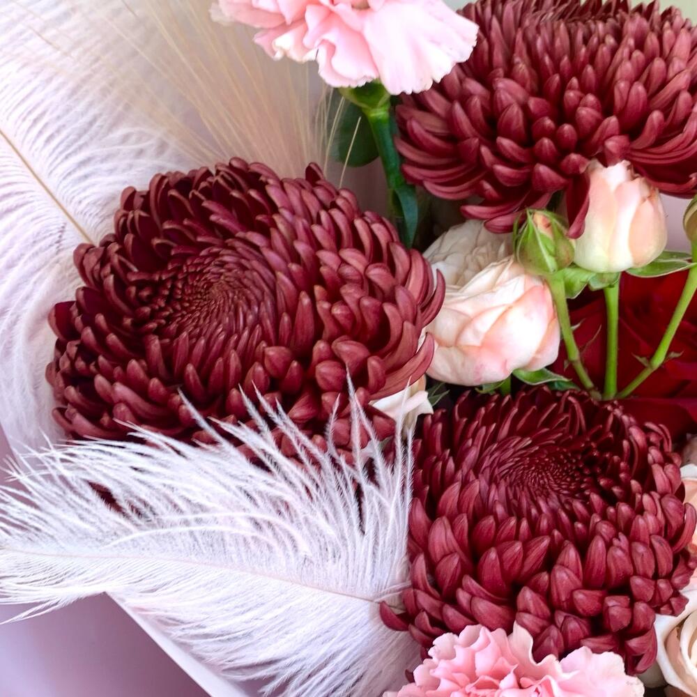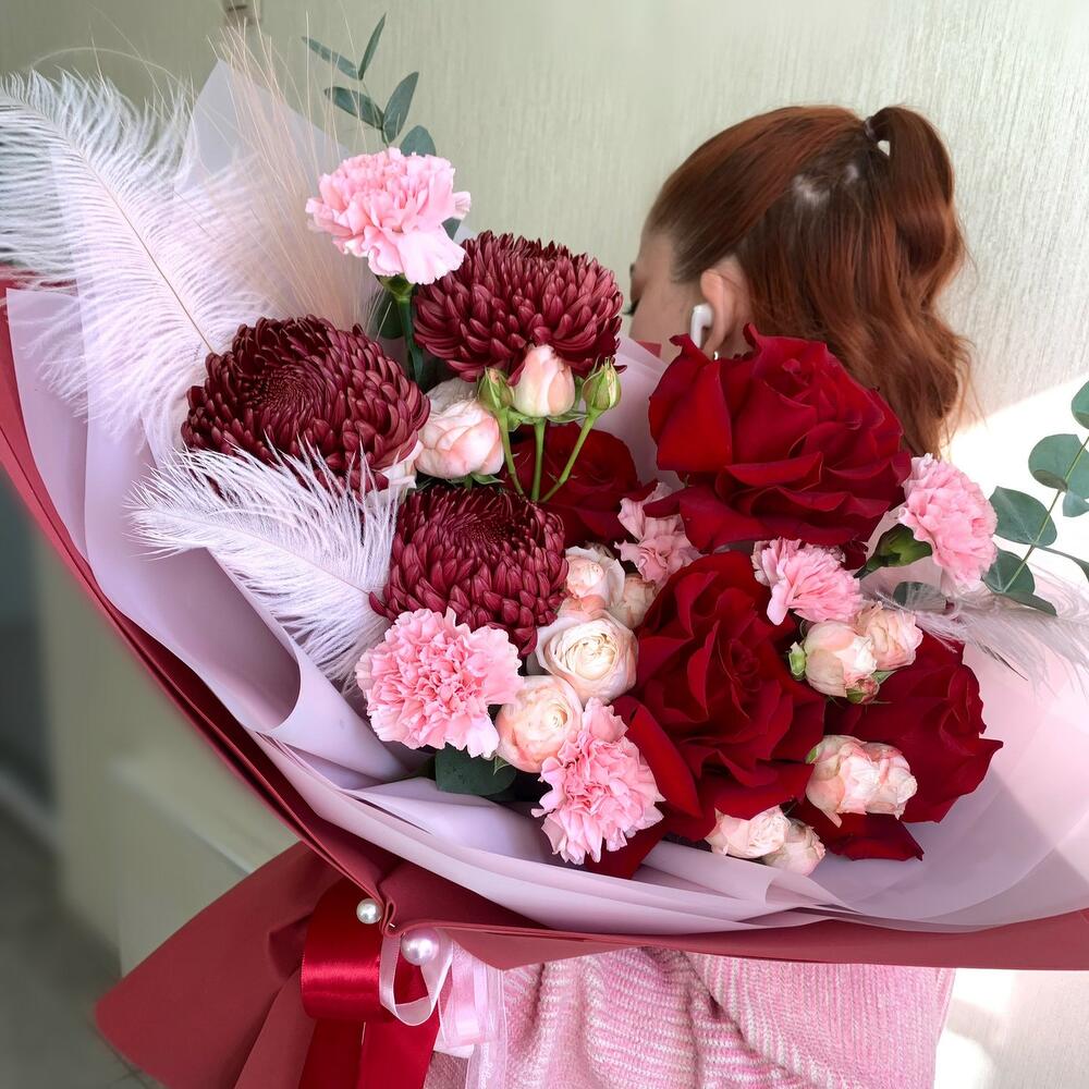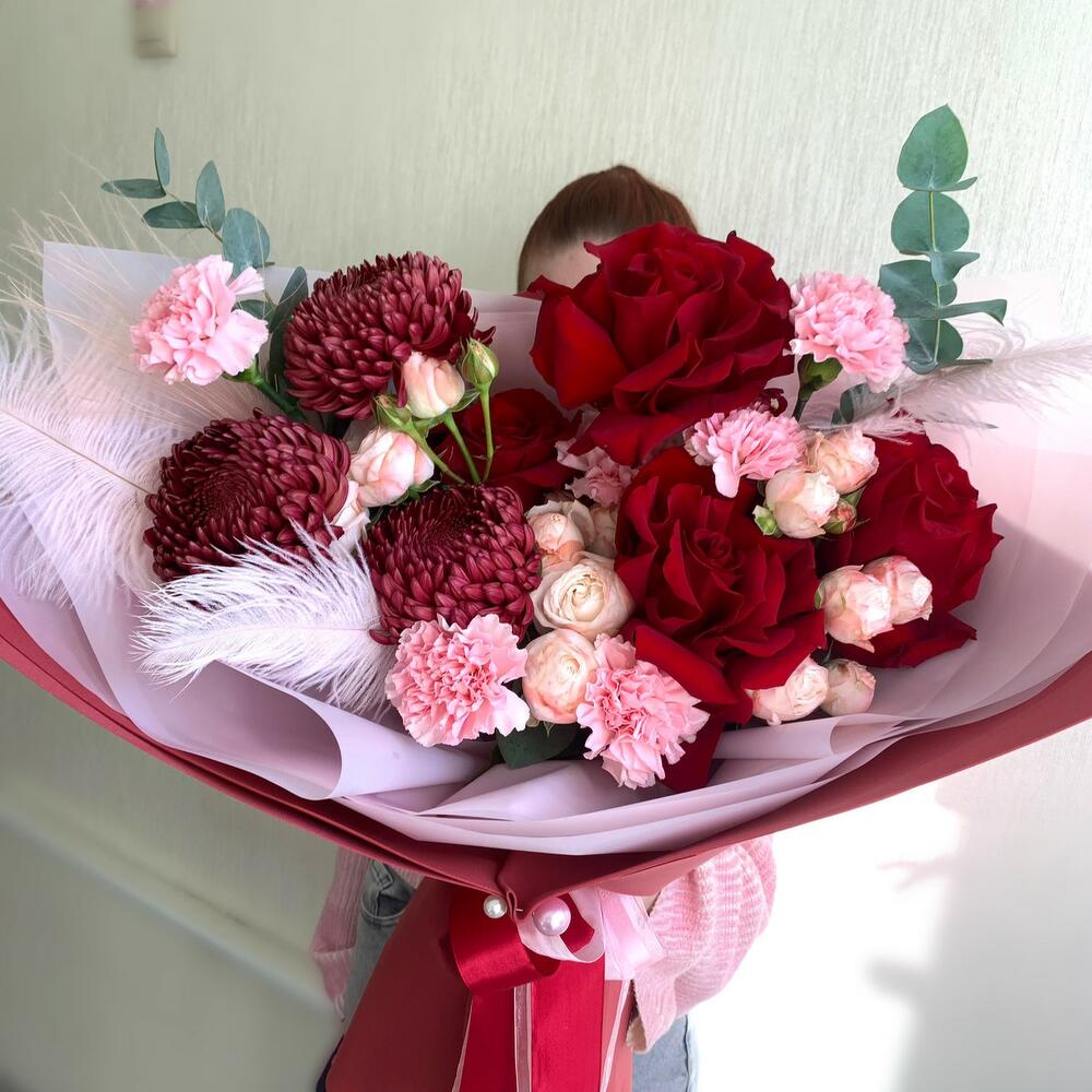 Этот изысканный букет включает в себя нежные диантусы, французские розы и пионовидные кустовые розы, великолепные хризантемы бигуди, утонченную стифу и ароматный эвкалипт. Этот букет станет прекрасным подарком для любого особенного случая.